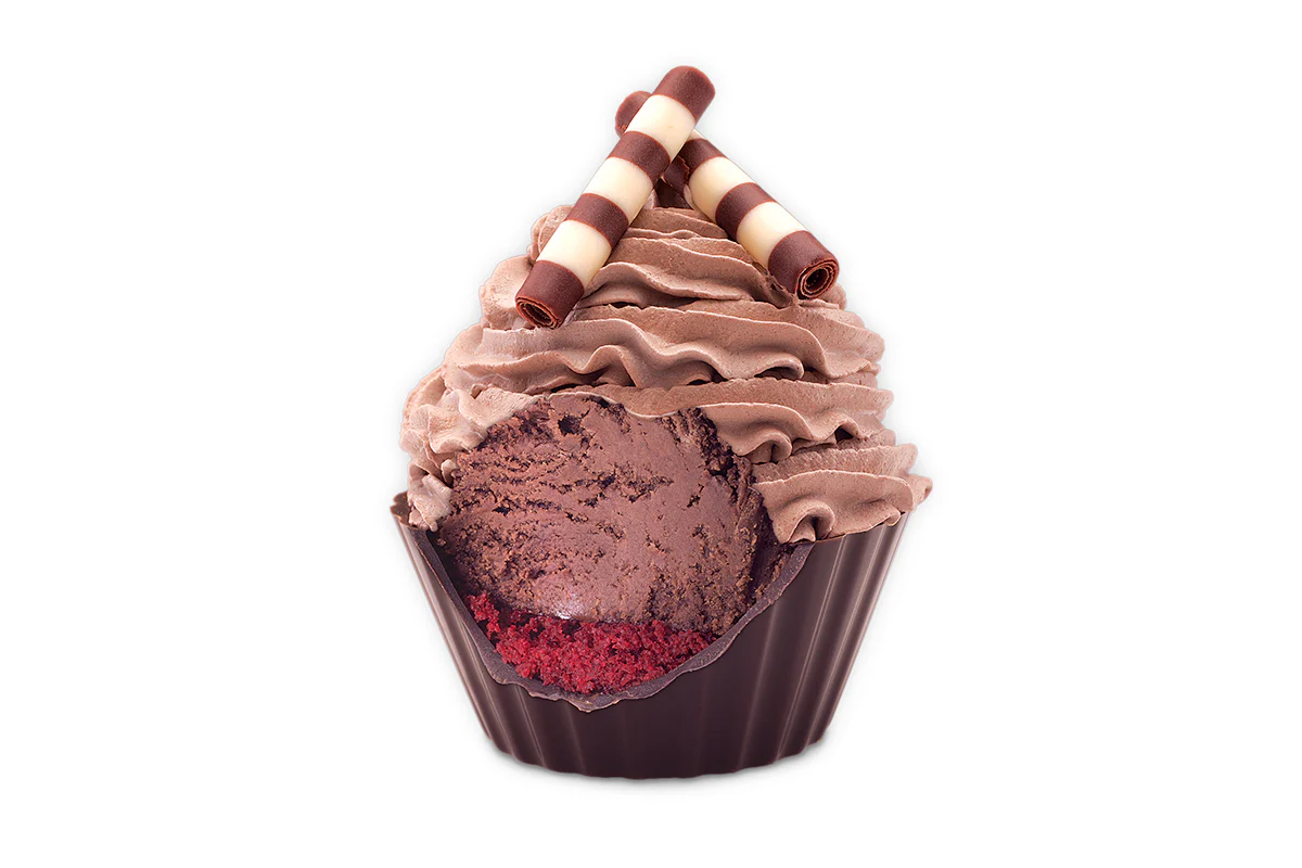 Choose from a variety of cupcakes! Sweet Cream Cupcake: A rich Chocolate Cup filled with a layer of Yellow Cake, Fudge and Sweet Cream Ice Cream topped with fluffy White Frosting and White & Milk Chocolate Curls Cake Batter™ Delux Cupcake: A rich Chocolate Cup filled with a layer of Red Velvet Cake, Fudge and Cake Batter Ice Cream® topped with fluffy Pink Frosting and Rainbow Sprinkles Double Chocolate Devotion™: A rich Chocolate Cup filled with a layer of Devil's Food Cake, Fudge and Chocolate Ice Cream topped with fluffy White Frosting and an OREO® Cookie